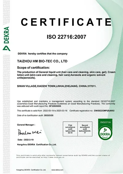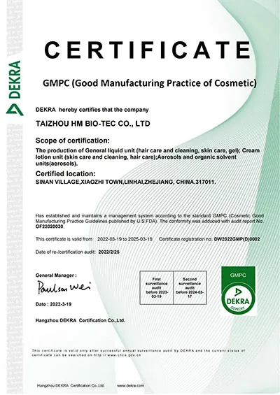 Taizhou HM Bio-Tec Co., Ltd. הוא המפעל הראשון לאירוסול בעיר טאיז'ו שהוקם בשנת 1993. הוא קרוב לנמל נינגבו ושנגחאי, וטיסה של שעתיים ישירות מגואנגזו. הוא משתרע על יותר מ- 50, 000 מ"ר עם חמישה קווי ייצור של אירוסול, שני קווי ייצור חומרי ניקוי אוטומטיים וקו ייצור אחד ממתקני אוויר אוויר, והושקע קו ניגוב בשנת 2020. המוצרים מיוצאים ליותר מחמישים מדינות. המותג שלנו נרשם בינלאומי וידוע מאוד בסימן המסחרי הסיני. העיקרון שלנו הוא "חיים קלים, חיים איכותיים".